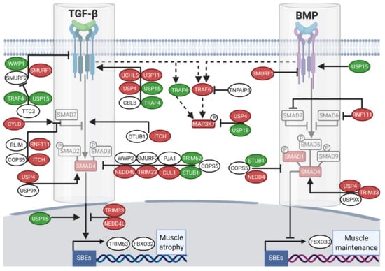 Muscle atrophy is defined as a loss of muscle mass and strength and is associated with adverse health outcomes, such as an autonomy decline and an increase in morbidity and mortality in many catabolic conditions (e.g., cancer cachexia, heart, and kidney failure, fasting, sepsis, injury, aging, or physical inactivity, etc.) [,,,,]. Given the increase in sedentary behavior and improvement in life expectancy, and with to date still no proven therapeutic or preventive treatment to date, muscle atrophy remains a major public health issue (World Health Organization data) []. Skeletal muscle tissue represents an important reservoir of amino acids, which are mobilized during catabolic situations to preserve vital functions, resulting in an imbalance of contractile protein turnover (i.e., proteolysis exceeding protein synthesis) [,]. Catabolic stimuli (e.g., oxidative stress, endoplasmic reticulum disturbances, nutrient shortage, mitochondrial disruptions, etc.) activate a complex network of intracellular modulators, which in turn lead to the activation of the ubiquitin-proteasome system (UPS) and autophagy [,]. These two main proteolytic systems in muscle tissue involve a set of genes, i.e., atrogenes, whose expression at the mRNA levels is commonly altered during atrophy []. Cascades of events and players of muscle atrophy are well described and conserved in mammals [,] and include the transforming growth factor-β (TGF-β) superfamily, with TGF-β signaling acting as a negative regulator, and Bone Morphogenetic Proteins (BMP) signaling as a positive regulator of muscle mass []. The TGF-β pathway mediates muscle atrophy through cytoplasmic and nuclear signaling molecules SMAD2/3, mainly leading to the expression of the atrogenes TRIM63 (MuRF1) and FBXO32 (atrogin-1) []. Constitutive expression of SMAD3 triggers muscle wasting, and inhibition of SMAD2 and SMAD3 is sufficient to induce muscle growth in vivo [,,,]. Conversely, the BMP pathway mediates muscle mass maintenance through cytoplasmic and nuclear signaling molecules SMAD1/5/9, promoting a negative transcriptional regulation for a ubiquitin ligase required for muscle wasting, FBXO30 (MUSA1) [], and increasing the expression of BMP receptors activity in muscles induced hypertrophy through Smad1/5-mediated activation of mTOR signaling [].