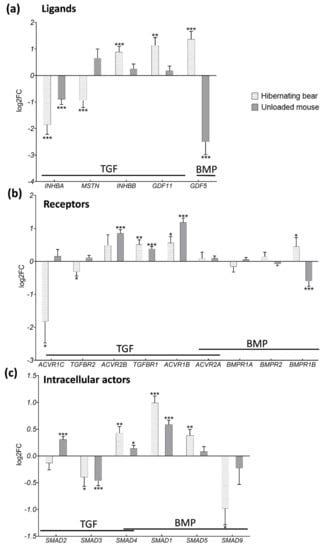 The gene expression pattern of TGF-β and BMP components is different in brown bear muscle resistant to atrophy during hibernation compared to atrophied muscles of the unloaded mouse. Genes expression level in vastus lateralis muscle of active and hibernating brown bears (n = 6 bears/season, the same individuals were sampled and analyzed in summer and winter, log2FC Winter/Summer, dotted white bars) and in soleus muscle of control and unloaded mice (n = 4 mice per condition, log2FC Unloaded/Control, gray bars). The depicted genes were categorized as TGF-β and BMP (a) ligands, (b) receptors, and (c) intracellular actors. Data are expressed as log2FC ± lfcSE. Statistical significance is shown (* padj < |0.05|; ** padj < |0.01|; *** padj < |0.001|).