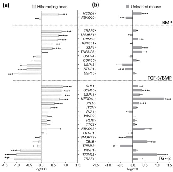 The gene expression pattern of muscle E3s/DUB enzymes involved in TGF-β and BMP pathway regulation differed in the atrophy-resistant brown bear muscle during hibernation compared to the atrophied muscle of the unloaded mouse. Genes expression level (a) in vastus lateralis muscle of active and hibernating brown bears (n = 6 bears/season, the same individuals were sampled and analyzed in summer and winter, log2FC Winter/Summer, dotted white bars), and (b) in soleus muscle of control and unloaded mice (n = 4 mice per condition, log2FC Unloaded/Control, gray bars). Data are expressed as log2FC ± lfcSE. Statistical significance is shown (* padj < |0.05|; ** padj < |0.01|; *** padj < |0.001|).