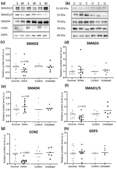 To further compare these models of resistance and vulnerability to atrophy, we explored the protein levels of the SMAD intracellular actors. In the brown bear muscle, we observed a tendency to decrease for SMAD2 protein levels (p = 0.09) in winter compared to summer, whereas SMAD3 levels remained quite similar between the two seasons (Figure 6a,c,d). Protein levels of SMAD4 were higher in muscles of the hibernating bear compared to the active one (Figure 6a,e), but the converse was observed for SMAD1/5 (Figure 6a,f). As for mRNA, these SMAD proteins did not follow the same regulation pattern in muscles of the unloaded mouse, where none changed at the protein level (Figure 6b–f). The protein levels of CCN2, a TGF-β target gene that is also an extracellular activator of the TGF-β pathway and an inhibitor of the BMP pathway, were strongly lower in winter bear muscles but were unaffected in unloaded mouse muscles (Figure 6a,b,g). Finally, the protein levels for GDF5, a BMP ligand, remained unchanged in both muscles from the hibernating bear and the unloaded mouse (Figure 6a,b,h).