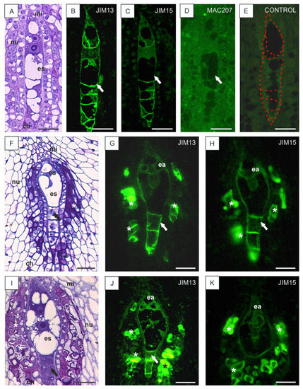 Histology of B. perennis ovules and immunolocalization of AGP epitopes during embryo sac development. Ovule nucellus with an embryo sac at an early stage of development (A). AGPs in the cell walls of the embryo sac (arrow); reaction with JIM13 (B), JIM15 (C), and MAC207 (D). Marked embryo sac (E). Later stage of embryo sac development than that shown in (A–E) (F). AGPs in the cell walls of the embryo sac and in cells surrounding the female gametophyte (asterisks); reaction with JIM13 (G) and JIM15 (H). Mature embryo sac at advanced stages of development (I). AGPs in the cell walls of the embryo sac and egg apparatus, reaction with JIM13 (J) and JIM15 (K). In (F–J) arrows point antipodal cells. In (G,H,J,K) asterisks point the integumental tapetum. Toluidine blue staining: (A,F,I). Immunolabeling: (B–E,G,H,J,K). Bars: 20 µm (A–K). Abbreviations: ch—chalazal pole, ea—egg apparatus, es—embryo sac, mi—micropylar pole, nu—nucellus.