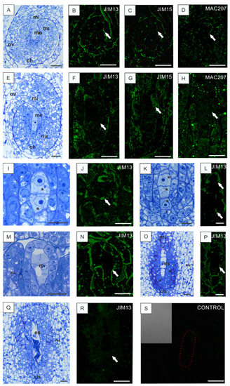 AGP localization in B. perennis ovules with disturbances in development caused by low temperature. Early stage of megasporocyte development (A). AGPs in the cell walls of the ovule (arrow); reaction with JIM13 (B), JIM15 (C), and MAC207 (D). Ovule with a formed megasporocyte (E). Epitopes of AGPs in the cell walls of adjacent megasporocyte cells of the nucellus and not visible in cell walls and cytoplasm of the megasporocyte (arrow); reaction with JIM13 (F), JIM15 (G), and MAC207 (H). Dyad stage (asterisks) (I). AGPs in dyad walls (arrow); reaction with JIM13 (J). Linear tetrad of megaspores (asterisks) (K). AGPs in the walls of megaspores (arrows); weak reaction with JIM13 (L). Stages of megaspore (M) and embryo sac formation (O). AGPs in the walls of somatic nucellus tissue (arrow); reaction with JIM13 (N,P). Degenerated embryo sac (Q). Absence of a fluorescence signal in the degenerated embryo sac (arrow); reaction with JIM13 (R). Control reaction with a marked embryo sac (S). Toluidine blue staining: (A,E,I,K,M,O,Q). Immunolabeling: (B–D,F–H,J,L,N,P,R,S). Bars: 20 µm (A–H), 10 µm (I–S). Abbreviations: ch—chalazal pole, es—embryo sac, m—megaspore, me—megasporocyte, mi—micropylar pole, nu—nucellus, ov—ovary wall.