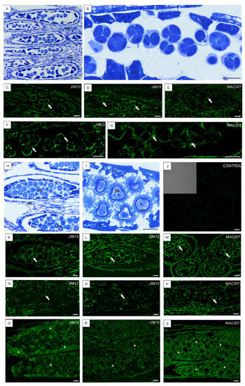 In our previous article [12], the distribution of AGPs during male gametophyte development in optimal conditions was analyzed. The temporal and spatial localization of AGPs at different developmental stages using JIM13, JIM15, and MAC207 were described. In the current work, we focused on the occurrence of AGPs during anther tissue differentiation in low temperature conditions (Figure 4 and Figure 5). In anthers with no significant signal of disruption during development, the distribution of AGP epitopes at the early stages of differentiation was not changed in comparison to the development in the optimal conditions (described in detail in the publication by Chudzik and coworkers [12]). The immunolabeling of sections with the whole anther showed that microsporocytes differed markedly in the intensity of the fluorescence signal from other cells (Figure 4C). At the early stages of differentiation of microsporocytes (Figure 4A,B), AGPs recognized by JIM13, JIM15, and MAC207 were noticeable in both the somatic cells of the anther wall and in the cells inside the loculus (Figure 4D–F). With the progress of microsporogenesis, the signal was more specific and strong in tapetal cells (Figure 4G,I,K). The higher magnification of the sections revealed very strong fluorescence in the common wall surrounding the microspores (Figure 4H,J,L). There were no differences in the fluorescence after application of the particular antibodies.