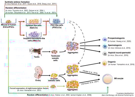 Mammalian cells are divided into somatic and germ cells according to their roles. Somatic cells are involved in the homeostasis and survival of the body, whereas germ cells are dispensable for survival; however, they are needed only for reproduction. The ancestors of germ cells are unipotent and undergo a process called gametogenesis, to differentiate into either spermatozoa or oocytes. In vivo gametogenesis is a very sophisticated process that is difficult to recapitulate in an in vitro system. The development of stem cell differentiation protocols has made it possible to obtain many functional cell types in vitro, including somatic and germ cells. In particular, since approximately two decades, in vitro gametogenesis from pluripotent stem cells (PSCs) has been focused on in developmental biology and stem cell research [,]. In mice, PSCs can differentiate into functional germ cells, which can be fertilized and developed to term after implantation [,]. However, mature germ cells capable of forming embryos after fertilization have yet to be derived from human PSCs.