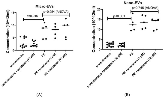 We confirmed previous reports [40] that the amount of micro- and nano-EVs extruded from preeclamptic placentae was significantly increased compared to the number of EVs released from normotensive placental explants (Figure 1A, p = 0.016, or Figure 1B, p < 0.01, respectively). The treatment with melatonin (either 1 µM or10 µM) did not change the amount of micro-EVs (Figure 1A, p = 0.954, ANOVA) or nano-EVs (Figure 1B, p = 0.776, ANOVA) extruded from preeclamptic placental explant cultures.