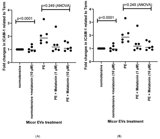 A human microvascular endothelial cell line, composed of HMEC-1 cells (ATCC, CRL-3243), was grown until confluent in 96 well culture plates in MCDB 131 media. The endothelial cells (HMEC-1) were exposed to placental micro- or nano-EVs from preeclamptic placental explants or from normotensive placental explants which had been treated with or without melatonin for 24 h. After the removal of the remaining placental EVs by washing with PBS, the cell surface expression of ICAM-1 by HMEC-1 monolayers was determined by a cell-based ELISA, as described previously [13]. Each measurement of ICAM-1 was conducted in quadruplicate. The data are presented as the median and 5th and 95th percentiles of the fold changes relative to untreated controls.