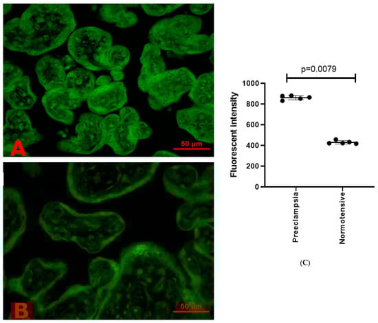 Misfolded proteins in preeclamptic and healthy placentae and in the preeclamptic placental explants that had been treated with melatonin were measured using a fluorescent compound, Thioflavin-T (ThT, Sigma-Aldrich, Sydney, Australia), as described previously [37,38]. Briefly, frozen placental sections (5 µm) were fixed with 4% paraformaldehyde (PFA) for 5 min at room temperature and washed with PBS. The sections were then stained with ThT (500 µM dissolved in PBS) for 3 min at room temperature, followed by counter-staining with DAPI for 1 min. The sections were then mounted with Citifluor and examined using a fluorescent microscope (Nikon, ECLISPE Ni-E, Tokyo, Japan). Sections from which ThT was omitted were used as negative controls.