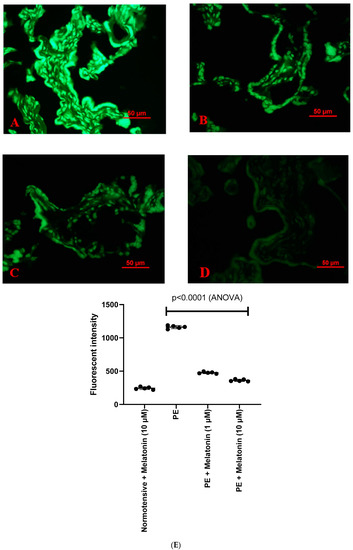 In addition, there were significantly increased levels of misfolded proteins in preeclamptic placentae (Figure 4A), compared to normotensive placentae (Figure 4B), measured by the increased fluorescent intensity levels of ThT in a semi-quantitative assay (Figure 4C, p = 0.0079). However, the treatment of the preeclamptic placentae with melatonin (1 µM Figure 5B or 10 µM Figure 5C) significantly reduced the fluorescent intensity of ThT in preeclamptic placentae, compared to the untreated ones (Figure 5A), measured by a semi-quantitative assay (Figure 5E, p < 0.0001). There was also no dose response in the reduction of the fluorescent intensity of ThT (Figure 5E, p > 0.05).