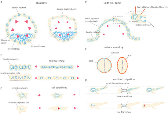 Intermediate filaments, guardians of tissue and cell integrity, adapt cell mechanics to cell behavior. (A). During embryo cavitation, keratins are essential to generate apical tension (pink arrowheads) against the increasing internal pressure in the blastocyst. This tension is lost in the absence of keratin 8 and 18, which leads to a decrease in volume and increased surface curvature. (B,C). Depletion of keratin in a collective cell sheet and vimentin in single cells increases cell deformation upon stretching. In vimentin-depleted cells, this leads to an increase in cell death. (D). Expanded epithelial domes consist of stretched and unstretched cells. Stretched cells contain unusually straight keratin bundles, which, when disrupted by laser ablation, cause the cell to lose its shape and largely increase its area. (E). The vimentin network contributes to cortical tension during mitotic rounding. The loss of vimentin impairs rounding and induces abnormalities in chromosomal aggregation. (F). Both keratin and vimentin IFs slow down confined migration. Depletion of keratin or vimentin in different cell types increases their confined migration speed but promotes nuclear damage (red lightning sign).