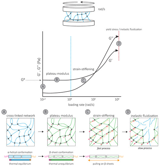 The mechanical properties of IF networks characterized by oscillatory shear rheology experiments of in vitro assembled networks (A). Deformation of the network using oscillatory shear rheology is achieved by network assembly between two plates and rotating one plate while the other is fixed, inducing a controlled deformation. Increasing the frequency of the rotations (rad/s) increases the stress and strain applied to the network. The response of the IF network to oscillatory shear is viscoelastic. Within the range of 0.01 and 10 rad/s, G’ and G’’ are independent of the oscillatory frequency, and a plateau is observed in both the G’ and G’’ curves. The corresponding G’ is called the plateau modulus or G0 (B). Further increasing the stress by increasing the oscillatory shear frequency results in strain-stiffening of the network ((C), start is indicated with blue dotted line). The network strain-stiffens up to a critical stress, the yield stress ((D), red dotted line), at which the network ruptures. This corresponds to the start of inelastic fluidization. The plateau modulus results from attractive forces between filaments (grey circles) to maintain the stretched β-sheet conformation of single filaments between crosslinks which are in thermal unequilibrium ((B), green filaments). The weaker inter-filament interactions between filament rod domains are thought to be responsible for the attractive interactions at low loading rates. Lower forces are required to resist the lower stresses (pink). Strain-stiffening results from the stretching of single filaments in β-sheet conformations ((C), yellow arrows) maintained by stronger inter-filament interactions. C-terminal tails of IFs are thought to be responsible for these inter-filament attractive interactions, which have to resist high stresses (pink). At the critical yield stress, the network ruptures as a result of the unbinding of multiple crosslinks (D). Strain-stiffening and inelastic fluidization compete at high stresses, resulting in a loading-rate-dependent rupture of the network [72]. Strain-stiffening is a fast process (C) while inelastic fluidization is slow (D). At fast loading rates, strain-stiffening dominates, and the network can resist higher stresses. At slow loading rates, the unbinding of crosslinks has time to occur within the same time frame as strain-stiffening, resulting in rupture of the network at lower stresses.