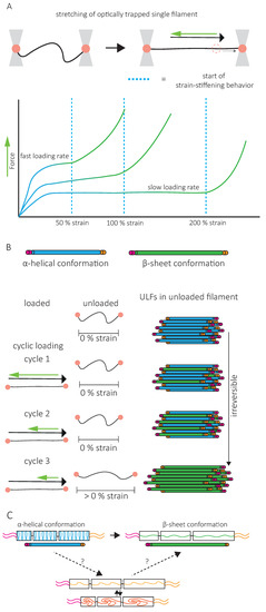 Upon repeated loading and unloading cycles, filaments progressively soften, indicating a dissipation of energy [73] (Figure 5B). The filament recovers its initial length between consecutive cycles, but the energy needed to stretch the filament a second time is always lower, no matter the time spent between the first and the second cycle [92]. This suggests that alterations in mechanical properties following filament stretching are not reversible within reasonable time scales, a signature of a tensile memory. A potential explanation of IF tensile memory is that the α-helical rod domain of each monomer reacts independently to the applied load [73] (Figure 5B). During unloading, some monomers remain in the β-sheet conformation, forming a ULF with a mix of proteins in α-helix and β-sheet conformations (Figure 5B). With each loading and unloading cycle, an increasing number of α-helices transit to β-sheets. The remaining α-helices, which are shorter than β-sheets, determine the filament length and thus primarily experience the force applied during re-stretching. As long as some monomers are still in an α-helical state, the filament returns to its initial length, but as the number of α-helices decreases, the force needed to achieve the same strain decreases. The softening of the filament and apparent dissipation of energy are explained by the higher energy required to keep the monomer in a β-sheet state within the relaxed filament. Part of the energy used to stretch the filament is stored in the monomers in a β-sheet state and is dissipated when β-sheet elements return to the α-helical conformation upon relaxation [73].