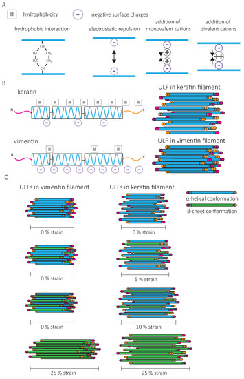 IF subunit interactions and diversity. (A). Interactions between intermediate filament proteins result from hydrophobic (H) and electrostatic interactions (circled charges). The presence of cations can tune electrostatic interactions. (B). Differences in amino acid sequences between vimentin and keratin account for differences in hydrophobic and electrostatic interactions. Lateral coupling within single vimentin IFs is much more pronounced compared to keratin IFs in the presence of high ionic concentrations due to higher negative surface charges. (C). Differences in hydrophobic and electrostatic interactions account for the different mechanical responses observed for vimentin and keratin. Increased lateral coupling between vimentin filaments makes elongation impossible unless all subunits have adopted the β-sheet conformation (green). Keratin filaments elongate as soon as some subunits are in a β-sheet conformation. ULF = Unit Length Fragment. Adapted from Lorenz et al., Phys. Rev. Lett. 2019.