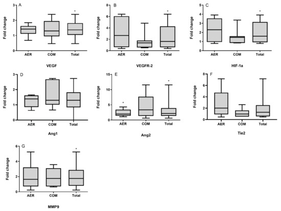 Box-plot diagrams showing the changes in the mRNA expression of vascular endothelial growth factor (VEGF; A), vascular endothelial growth factor receptor 2 (VEGFR-2; B), hypoxia-inducible factor 1 alpha (HIF-1α; C), angiopoietin 1 (Ang1; D), angiopoietin 2 (Ang2; E), angiopoietin receptor (Tie2; F), and matrix metallopeptidase 9 (MMP9; G) in the skeletal muscle of heart failure patients following either high-intensity-interval training (HIIT; N = 6) or combined HIIT with strength exercise training (COM; N = 7) and in the total number of patients (N = 13). * Significantly different compared to pre-exercise levels p < 0.05.