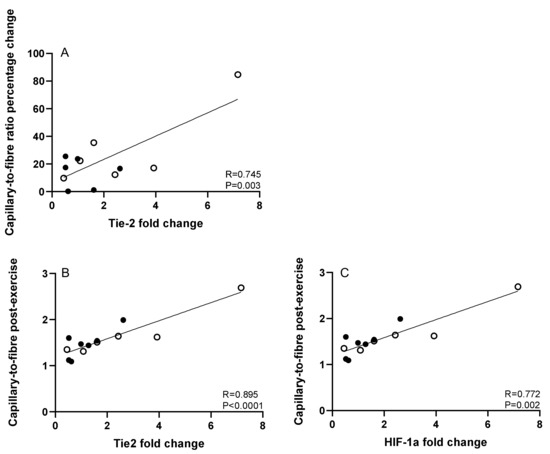 There was a strong correlation between the Tie2 fold change in mRNA expression post-training and the capillary-to-fibre ratio percentage change following exercise training (R = 0.745, p = 0.003; Figure 2).