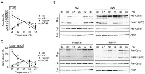 Effects of various temperatures on inflammasome activation. LPS-primed BMDMs were treated with NG, MSU, flagellin, or dsDNA at 25, 33, 37, 39, or 42 °C. (A) IL-1β secretion of the BMDMs was measured by ELISA. IL-1β secretion at 37 °C by each trigger was set as 100%, and the graph was drawn. (B) Casp1 (p20) secretion was analyzed by immunoblotting. (C) The relative intensity of Casp1 (p20) bands are presented as a graph. The graphs present the mean ± standard deviation (SD) of at least two independent experiments, and immunoblotting images are representative of two independent experiments. * p < 0.05 vs. NG, flagellin, and dsDNA.