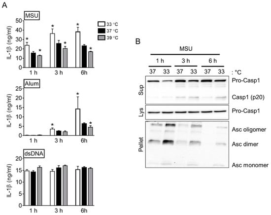 Effect of MSU crystals and alum particles on inflammasome activation at different temperatures. (A) LPS-primed BMDMs were treated with MSU crystals, alum particles, or dsDNA at 33, 37, or 39 °C for the indicated time. IL-1β secretion was measured by ELISA. (B) LPS-primed BMDMs were treated with MSU crystals and incubated at 33 or 37 °C for 1, 3, or 6 h. The secretion of Casp1 (p20) and the formation of ASC pyroptosome were analyzed by immunoblotting. The bar graphs represent the mean ± standard deviation (SD) of at least two independent experiments, and immunoblotting images are representative of two independent experiments. * p < 0.05 vs. 37 °C.