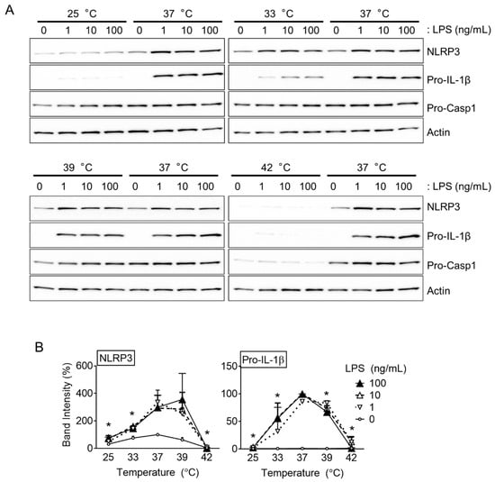 Effects of temperatures on the priming step. BMDMs were treated with increasing dosages of LPS (1, 10, and 100 ng/mL) for 3 h at 25, 33, 37, 39, or 42 °C. (A) The levels of NLRP3, pro-IL-1β, and pro-Casp1 expression were determined by immunoblotting. (B) The band intensities of NLRP3 and pro-IL-1β were analyzed. The bar graphs present the mean ± standard deviation (SD) of at least two independent experiments, and immunoblotting images are representative of two independent experiments. * p < 0.05 vs. 37 °C.
