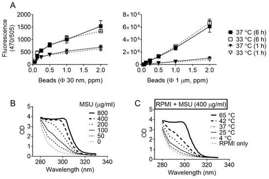 Effects of temperature on phagocytosis and MSU solubility. (A) BMDMs were incubated with increasing concentrations of beads at 33 or 37 °C for 1 or 6 h. The phagocytosis rate was analyzed by the fluorescence units inside the cells. (B) An increasing concentration of MSU was dissolved in DW and measured OD from 280 to 330 nm. (C) MSU (400 μg/mL) was added in PRMI 1640 and incubated at the indicated temperature for 3 h. After eliminating the crystals by filtration, the RPMI 1640 was measured OD from 280 to 330 nm. The graphs present the mean ± standard deviation (SD), and B and C graphs shows the mean of at least two independent experiments.