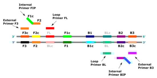 Primers used in the LAMP reaction. FIP (forward internal primer) contains a region F2 complementary to F2c of the matrix, and a free region F1c complementary to F1 on the newly-formed strand; BIP (backward internal primer) contains a region B2 complementary to B2c of the template, and a free region B1c complementary to B1 on the newly-formed strand; F3 (forward external primer) contains a region F3 complementary to F3c of the template; B3 (backward external primer) contains the region B3 complementary to B3c of the template; FL (forward loop primer) is complementary to the single-stranded loop between regions F2 and F1; BL (backward loop primer) is complementary to the single-stranded loop between regions B2 and B1. (Based on http://loopamp.eiken.co.jp/e/lamp/primer.html (accessed on 1 June 2021)).