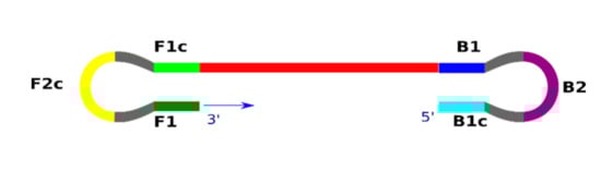 Schematic of a single-stranded DNA dumbbell-like structure, an artificial template for further amplification of the reaction using the LAMP technique. (Based on http://loopamp.eiken.co.jp/e/lamp/principle.html (accessed on 1 June 2021)).