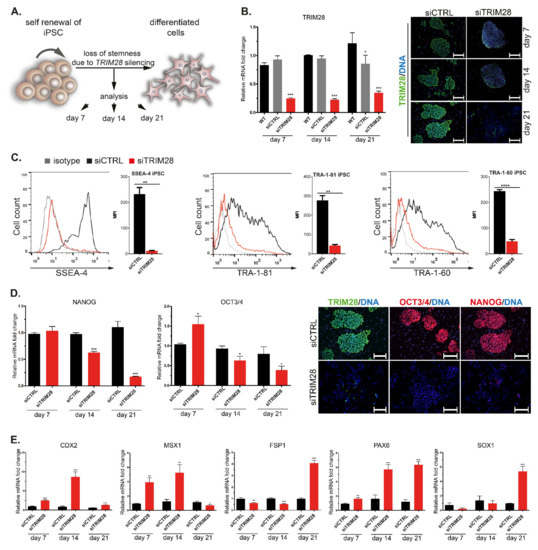 Silencing of endogenous TRIM28 induces downregulation of pluripotency markers and differentiation of human iPSC. (A) Endogenous TRIM28 was silenced in human iPSC with siRNA. Stemness and differentiation status were analyzed every 7 days for 3 weeks. (B) Silencing of TRIM28 at transcriptional and protein level confirmed by qRT-PCR (left) and immunofluorescence staining (right; green—TRIM28, blue—DAPI). Scale bar: 100 μm. Representative images are shown in the figures. (C) Flow cytometry analysis revealed decreased expression of extracellular pluripotency markers SSEA-4, TRA-1-60, and TRA-1-81 in siTRIM28 iPSC (red) vs. CTRL iPSC (black). Isotype control is marked in gray. (D) The progressive loss of intracellular pluripotency markers (NANOG, OCT3/4) expression in siTRIM28 iPSC confirmed with qRT-PCR (left) and immunofluorescence staining (right). Cells were stained at day 21. Scale bar: 100 μm. (E) qRT-PCR of differentiation-associated markers shows their upregulation during spontaneous differentiation of siTRIM28 iPSC. (B–E) Graphs represent mean (SD), n = 3. Statistical analysis was performed with t-student and ANOVA tests; p ≤ 0.05 (<0.0001 ****; 0.0001–0.001 ***; 0.001–0.01 **; 0.01–0.05 *; ≥0.05 not significant).