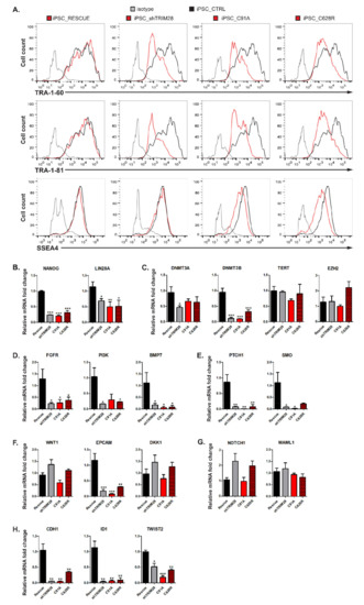 Cells were stained in 3 biological replicates, 10 passages after lentiviral transduction. Cell pellets were suspended in 100 μL DPBS (#L0615, Biowest, Nuaillé, France) with 1% BSA (#A9418, Sigma-Aldrich, St. Louis, MO, USA) and a primary antibody. The antibodies are listed in Table S3. Antibodies were administered in the following proportions: anti SSEA-4 1:50; anti TRA-1-60 1:50; anti TRA-1-81 1:50; anti IgG 1:50; anti IgM 1:50. Cells were incubated for 30 min at 4 °C and then washed 3 times with DPBS. Cell pellets were suspended in 100 μL 1% BSA in DPBS with biotin-conjugated secondary antibodies and incubated for 30 min at RT (IgG and IgM, 1:200). Cells were washed 3 times with DPBS, and pellets were suspended in 100 μL 1% BSA in DPBS and streptavidin APC conjugate (#17-4317-82, eBioscience, San Diego, CA, USA) and incubated at RT in the dark for 15 min. Cells were washed 3 times with DPBS, and pellets were suspended in 150 μL of 1× BD CellFIX fixing agent (#340181, BD Biosciences, San Jose, CA, USA). Cells were counted on a Becton Dickinson flow cytometer (BD Biosciences, San Jose, CA, USA FACSAria). The results were analyzed with the FlowJo_V10 (RRID:SCR_008520, FLOWJO, LLC Data Analysis Software).