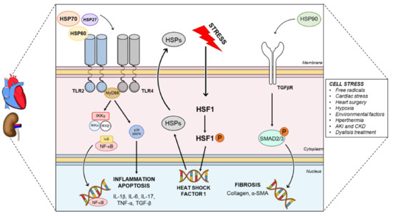 In summary, the most powerful system of myocardial-renal HSP-targeted is represented in the Figure 1. In general, the TLR2/4 pathway is the one that interacts with both organs and innate immune system. This conversation between heart–kidneys axis and HSPs depends on different molecular mechanisms of action. In general, HSP27, 60 or 70 couple to TLRs activating IKKγ or MAPK/p38 pathways. In the nucleus, NF-kB is responsible for the inflammatory gene expression while p38 activates the apoptotic genes [27,141]. This inflammatory response is observed in many cardiac injuries and kidney diseases, in addition of CRS itself [80]. Not only can this inflammation be induced by HSPs in CRS, but also the fibrosis observed during the syndrome [41,142]. The interaction of HSP90 with the receptor of TGF-β has been described to stimulate fibrosis by SMAD2/3 in renal tissue and can also promote fibroses in heart [143]. Last, but no less important, stress factors (free radicals, hypoxia, environmental factors, etc.) caused by CRS can directly induce an increase on HSPs expression by HSF1 phosphorylation. The activation of HSF1 has already been studied to cause cardiac dysfunction [144] and cause more apoptosis during renal injury [145].