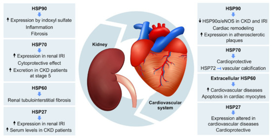 In this sense, the possibility of applying pharmacological agents to induce or inhibit the expression of HSPs as a means of preventing kidney and heart diseases, and even in organ transplantation, has been demonstrated to be important according to translational studies. Despite the great advances in knowledge regarding the role of HSPs in cellular processes, we are still far from understanding the entire process. Thus, a better understanding of how HSPs mediate kidney–-heart axis disease is required.