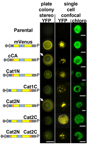 All constructs were generated with the pOpt2 vector expressing fluorescent marker: mCerulean3 (pOpt2-CFP vector) or mVenus (pOpt2-YFP vector) (Wichmann et al., 2018). Targeting peptide for citrate synthase (CIS2) to express the CIS2-CFP recombinant protein was taken from our previously described plasmid constructs [9,27]. To express recombinant proteins of YFP with Chlamydomonas catalase 1 or 2 (CAT1 and 2, Cre09.g417150 and Cre01.g045700, respectively), the expression vectors were constructed by inserting double-stranded oligonucleotides encoding 25 amino acids of N- or C-terminal sequence of CAT1 and 2, listed in Table 1, in the pOpt2-YFP vector. The N-terminal targets were cloned into the pOpt2-YFP vector between NdeI-BamHI (N-terminal end of YFP). The C-terminal targets were cloned into the pOpt2-YFP vector between EcoRV-EcoRI (C-terminal end of YFP without stop codon). Transformation of UVM4 was conducted by the glass-bead method as previously described [28] and colonies were selected with paromomycin (10 mg/L), zeocin (15 mg/L), or both, depending on the desired combination of constructs. Screening for the expression of each targeted marker was carried out by stereo microscopy on the agar-plate level as previously described [27] and several transformants for each construct were generated prior to confocal microscopy.