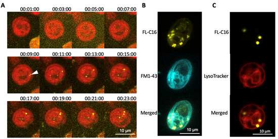 To investigate the mechanism of FA incorporation in C. reinhardtii, we first monitored FL-C16 incorporation by time-lapse microscopy. This analysis revealed FL-C16 speckles in the cytosol within 10 min after addition to the medium (Figure 2A). A green lipophilic fluorescent dye (FM1-43) was added to the medium in addition to yellow FL-C16 as it is incorporated into the cells via the endocytic mechanism and stains the membranes [37]. During endocytosis, extracellular compounds are first surrounded by the plasma membrane and then the membrane is pinched off to form vesicles containing endocytosed compounds. FM1-43 marks the plasma membrane, endosomes, vesicles, and vacuolar membranes. Here, the signals of FL-C16 do not co-localize with those of FM1-43 (Figure 2B), strongly suggesting that C. reinhardtii does not incorporate exogenously added FA via the endocytic mechanism. Compartmentalization of exogenously added FA may occur via the autophagy-lysosome pathway which digests overloaded FAs within cells [38]. LysoTracker was also added to the medium in addition to 20 μM FL-C16. The fluorophore of LysoTracker is activated only at low pH and selectively stains acidic organelles such as lysosomes and autophagosomes [39]. Here, LysoTracker signals did not co-localize with those of FL-C16 (Figure 2C), indicating that FL-C16 is not in the acidic regions in the cells, at least during incorporation.
