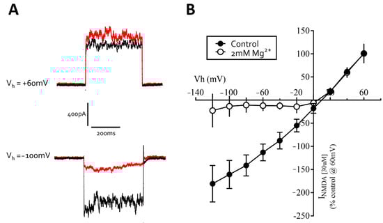 - Mayer, M.L.; Westbrook, G.L.; Guthrie, P.B. Voltage-Dependent Block by Mg2+ of NMDA Responses in Spinal Cord Neurones. Nature 1984, 309, 261–263. [Google Scholar] [CrossRef] [PubMed]