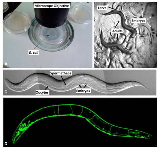 - Corsi, A.; Wightman, B.; Chalfie, M. A transparent window into biology: A primer on Caenorhabditis elegans. In WormBook: The Online Review of C. elegans Biology; WormBook: Pasadena, CA, USA, 2015. [Google Scholar] [CrossRef]