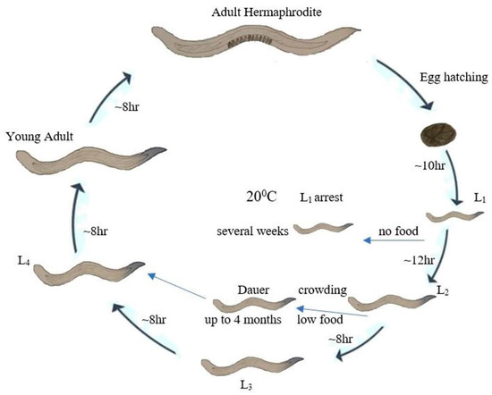 The life span of C. elegans is influenced by temperature [23,24], and they live for 23 days at 16 °C and nine days at 25 °C [25]. The average life span of C. elegans is 2–3 weeks and the generation time (from egg to adult) is about 56 h at 20 °C; the adults are about 1 mm in length. Figure 2 illustrates the life cycle of C. elegans (hermaphrodite). Similar to that of other nematodes, the life cycle of C. elegans consists of the embryonic stage, four larval stages (L1–L4), and adulthood [26]. Each larval stage ends in a molting stage, during which a new, stage-specific cuticle is grown, and the old cuticle is shed [27]. The size of the animal increases throughout the four larval stages, but distinguishing between separate sexes is not easy until the L4 stage [22]; at the L4 stage, hermaphrodites have a tapered tail, and the developing vulva can be seen in the middle of the ventral side as a transparent half-circle. At this point, the broader tail is seen on males but without a distinctive fan (later young adult consist of fan-shaped tail).