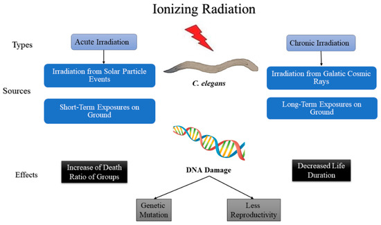 Research on C. elegans irradiation can be divided into the following two types based on the intensity and the length of exposure: acute and chronic exposures. Acute irradiation is a short-term exposure to a high dose, while chronic irradiation is prolonged exposure to a low dose over a determined period of time [55]. Quantitatively, exposures greater than 0.1 Gy/min would be accepted as acute, while exposures of less than 1 Gy/h would be accepted as chronic exposures by most radiobiologists; however, the intermediate levels are not well defined [56]. In nature, most of the irradiation from the solar particle events is characterized as acute irradiation, whereas irradiation from galactic cosmic rays is characterized as chronic irradiation (Figure 3) [57]. In addition to the natural irradiation of C. elegans that were flown to space for experiments, various other ground-simulated acute and chronic irradiation of C. elegans are discussed in this section. Both types of irradiation decreases the life span, increases the death ratio compared with control groups, and cause severe DNA damage, leading to genetic mutations and less fertility in C. elegans. The irradiation from solar particle events is short-term but is of high intensity; hence, it is considered that it is acute irradiation that has a high impact on the C. elegans’ biological life causing increased in the death and DNA damage and a decrease in life span, genetic mutation, and less reproduction [57]. The irradiation from galactic cosmic rays is considered a low dose, but a high exposure time; hence, it is considered chronic irradiation and it changes the biology of C elegans less than acute irradiation relatively [58].