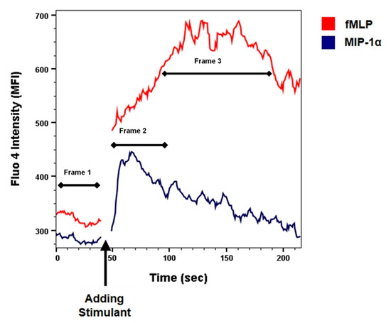 Frame 1: Baseline, the [Ca2+]i before stimulation with any chemoattractant (fMLP or MIP-1α). Mean time of 16.9 s (SD = 4.1 s).