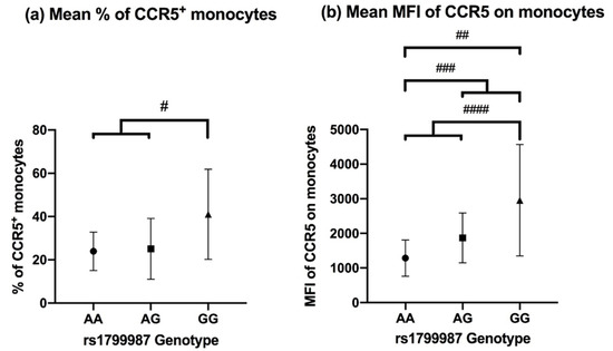 (a) Mean % of CCR5 positive (CCR5+) monocytes in 21 patients with the different genotypes for SNP rs1799987. Each patient was analyzed once. Comparison of AA vs. AG vs. GG (p = 0.094) was not significant, but comparison of GG vs. AA + AG showed a significant difference (p = 0.028) #. (b) Mean MFI of CCR5 on monocytes in 21 patients with the different genotypes for rs1799987. Comparing AA vs. GG (p = 0.026) ##, AA vs. AG + GG (p = 0.038) ###, AA + AG vs. GG (p = 0.012) ####.