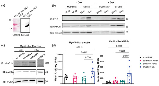 E2L3 knockdown preserved a-actin and MHCII in myofibrillar fraction in catabolic C2C12 myotubes. (a) A mixture of 11 recombinant E2 enzymes (E2 mix w/o E2L3) was used to address the selectivity of E2L3 antibody. A total of 1 μg of each E2 enzyme was used. Only E2L3 was recognized by the antibody used. (b) E2L3 is mainly present in the soluble fraction of C2C12 myotubes. C2C12-soluble and myofibrillar-enriched fraction were assayed for E2L3, GAPDH and alpha-tubulin (a-tubulin) by immunoblotting (IB) (20 and 40 μg of total proteins were loaded). GAPDH was used as marker of soluble-enriched fraction and a-tubulin as loading control. (c) Myofibrillar proteins were assayed for a-actin and MHCIIa levels by immunoblotting (15 μg of total proteins were loaded). C2C12 myotubes were cultured in 24-well plates, treated with Dex 1 μM and electroporated, as explained in Section 2, with two shRNA directed against E2L3 or MuRF1. (d) Densitometry analysis was performed on data from (c). Values were expressed after normalization with the loading control PCNA. Values are means SEM for n = 4 to 6 per group; p-values are indicated within the graph.