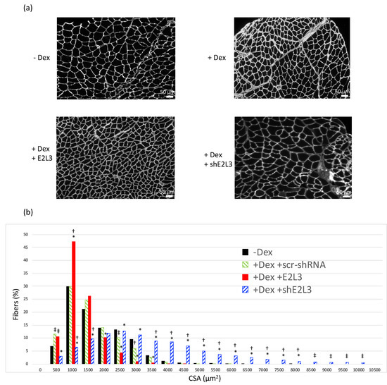 E2L3 KD and overexpression modify myofiber cross-sectional area (CSA). Mice treated or not with Dexamethasone (Dex 5 mg/kg/day) were transfected with either a scramble shRNA (scr-shRNA) targeting no known coding sequence, a mixture of two shRNAs (siE2L3, knockdown) directed against E2L3 or a plasmid encoding for E2L3 (E2L3, overexpression). Sh-encoding plasmids also encoded for emGFP, which allowed us to estimate the efficiency of transfection (typically around 50%; see Supplementary Materials Figure S2). Tibialis anterior muscle cross-sections were labeled with anti-laminin-α1 for determining CSA (see Section 2 for details). Four different zones and a minimum of 380 fibers were used for each muscle. (a) Representative cross-sections of T. anterior from each group are shown. Scale bar, 50 µm. (b) CSA analysis from n = 6 mice and a total of 17,945 fibers were analyzed, using a one-way ANOVA. Fibers distribution was analyzed within each muscle by grouping CSAs by 500 µm2 steps. A global shift towards lower CSA was observed when E2L3 was overexpressed in muscles. By contrast, larger CSA were observed in E2L3 KD muscles when compared to controls; n = 6 mice per group. * Statistically different from scr-shRNA group, p < 0.05. Statistically different from non-treated (-Dex) group, † p < 0.05, ‡ p < 0.1).