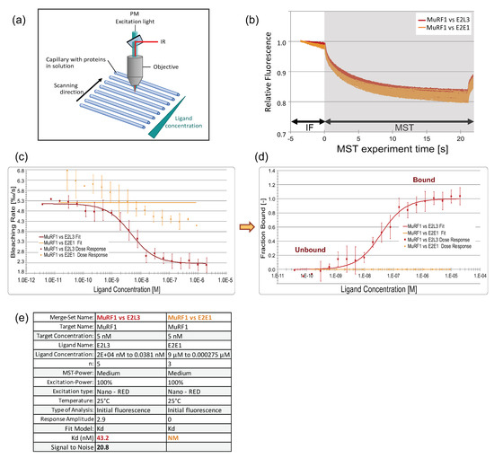 MuRF1–E2L3 affinity determination, using photobleaching rate. (a) Principle of the Monolith (adapted from Reference [50]). A fluorescent protein in solution in capillaries is excited with a UV LED; the fluorescence is recorded by a photomultiplier (PM) and plotted against time to get an MST (MicroScale-Thermophoresis) trace chart. (b) The fluorescent NT647–MuRF1 was mixed with the putative partner subjected to a 16-sample serial dilution. Variation of MuRF1 fluorescence was followed over time, in the presence of E2s; E2L3 (red), an interacting E2, and E2E1 (orange), a non-interacting E2 in this condition. When ligand binding changes the photobleaching properties of the fluorescent target, which is visible by the decrease in the initial fluorescence (IF) zone of the graph (t = −5 to 0 sec, before the Infra-Red (IR) laser was switched on), photobleaching rate has to be used for calculation of the affinity, instead of MST. (c) Dose–response curves are expressed in bleaching rate and plotted against E2s concentrations. (d) Transformation of dose–response curves from (c), in fraction bound for easier comparison between curves. (e) Dataset overview; n, number of replicates; NM, not measurable. A signal-to-noise >10 indicates a reliable result.
