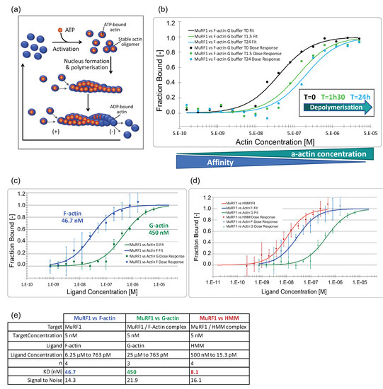 MuRF1 has a high affinity for filamentous actin and heavy meromyosin. (a) Scheme of actin poly- and depolymerization. Actin can be present either as a free monomer (G-actin) or as a linear polymer microfilament called F-actin (filamentous). Monomeric actin polymerizes at >2 mM K+ or Na+, and at >0.05 mM Mg2+. The (+) end of the actin filament tends to capture ATP-actin, thus promoting polarization, while, at the (−) end, the actin filament is mostly composed of ADP-actin that promotes depolymerization. A stationary equilibrium is achieved when the G-actin monomers are exchanged at both ends of the microfilament without any change to its total length. (b) Interaction of MuRF1 with F-a-actin during F-a-actin depolymerization. Capillaries containing MuRF1 and F-actin in G buffer were read immediately (T = 0 min) or stored for 1 h 30 or 24 h before reading, leading to the depolymerization of actin). (c) Dose–response curves for MuRF1 vs. F-actin in F buffer and vs. G-actin in G buffer. (d) Dose–response curves for MuRF 1 vs. F-actin in F buffer, vs. G-actin in G buffer and vs. heavy meromyosin (HMM, HMM includes the first 800 amino acids of the MHC, plus the two pairs of light chains). (e) Dataset overview.