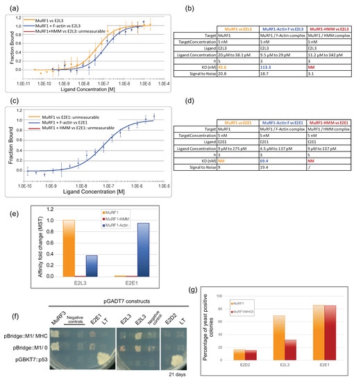 We then investigated whether F-actin and MHC could modulate the interaction between MuRF1 and the E2 enzyme, as it was the case between MuRF1 and some E2s in the presence of telethonin [23]. Then 5 nM of fluorescent MuRF1 was incubated with five times more moles of substrate, F-actin or HMM, at 22 °C during 30 min, to allow complexes formation and stabilization, followed by the addition of increasing concentrations of the E2 enzyme (E2L3 or E2E1) (Figure 5a–e and Supplementary Materials Figure S5).