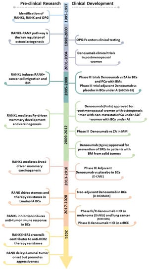 2.4. Anti-RANKL Therapy in BM: Discovery and Current and Future Perspectives