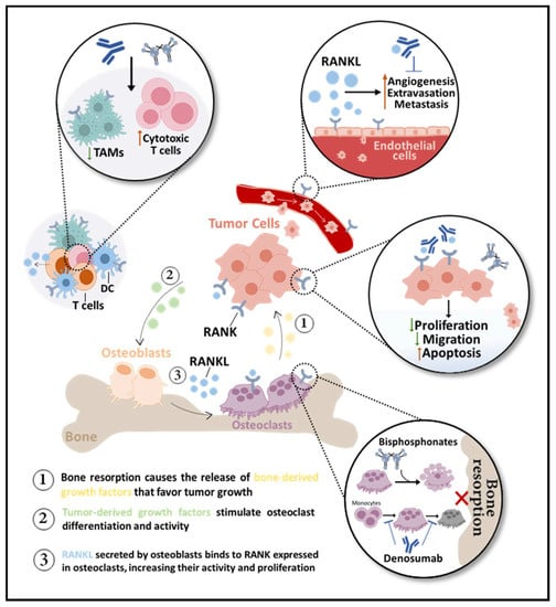 RANKL inhibition in bone metastases (BM). Bone-targeted agents (BTAs) are used to control BM by impairing bone resorption, indirectly affecting the tumor burden. While bisphosphonates only affect mature osteoclasts, inducing apoptosis, the anti-RANKL antibody denosumab prevents osteoclast differentiation, activity, and survival. Denosumab may also be antiangiogenic over RANK-positive endothelial cells. RANK is expressed in dendritic cells (DC) and macrophages, like tumor-associated macrophages (TAMs), and T-cell derived RANKL inhibition decreases TAMs and increases cytotoxic T cells. Potential direct effects of BTAs in tumor cells include inhibition of proliferation and migration and induction of apoptosis.