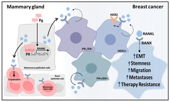 The role of RANKL/RANK signaling in the breast spans from physiologic development to breast cancer (BCa). RANKL expression in mammary epithelial cells is regulated by progesterone (Pg)-activated receptors and activates RANK in RANK-expressing luminal and basal cells, promoting proliferation, differentiation, migration, and survival. Expansion of mammary stem cells is associated with carcinogenesis. In BCa cells, RANKL-RANK signaling pathway is associated with aggressiveness features independently of subtype, including epithelial-to-mesenchymal transition (EMT), stemness, migration, metastases and therapy resistance.