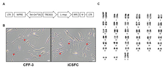 To generate iCSFCs, the lentivirus carrying pDINEO-L-myc was produced in 293FT packaging cells, then used to infect CFF-3 cells. iCSFCs were selected by treatment with G418 (500 g/mL, Sigma–Aldrich, St. Louis, MO, USA) for 2 weeks. The iCSFCs were maintained and expanded in DMEM with 10% FBS (GenDEPOT), 10 g/mL gentamicin, and 1 g/mL doxycycline.