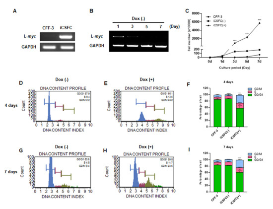 L-myc expression in iCSFCs. (A) RT-PCR analysis indicate that the L-myc gene was over-expressed in iCSFCs in the presence of doxycycline (Dox, 1 g/mL) following infection with the L-myc lentivirus, but not in primary CFF-3 cells. GAPDH is used as the loading control. (B) The expression of L-myc gradually decreased in the absence of Dox, as measured by RT-PCR. Dox-induced L-myc expression stimulated the proliferation of iCSFCs. iCSFCs were cultivated with Dox for 7 days, thereafter without Dox. Dox removal reduced L-myc expression and L-myc-induced proliferation in iCSFCs as time-dependent manner. (C) Growth curves of CFF-3 cells and iCSFCs in the absence (-) and presence (+) of Dox. Cell numbers were counted every 48 h for 5 days. Neither CFF-3 cells nor Dox-starved iCSFCs showed a significant increase in cell number. Expression of L-myc in the presence or absence of Dox influenced cell proliferation. (D,E,G,H) Cell cycle anlaysis of iCSFCs in the absence and presence of DOX according to the Muse™ cell analyzer. Notably, doxycycline significantly increased the proportion of iCSFCs in G2/M phase. (F,I) Representative graphs of (D,E), (G,H), respectively. Data shown in graphs are the means ± SEM of four independent experiments. **, p < 0.01; ***, p < 0.001.