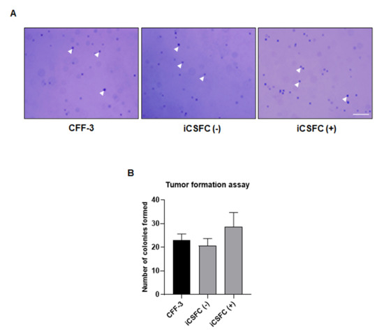 Tumor formation assay in iCSFCs. (A) Tumor formation ability of iCSFCs was assessed by colony formation. For tumor formation assay, cells were cultured for 14 days. The iCSFCs did not form colonies on soft agar containing CFF-3 ICSFC (Dox -) or ICSFC (Dox +) (Scale bars, 200 m). (B) The graph represents the number of formed colonies.