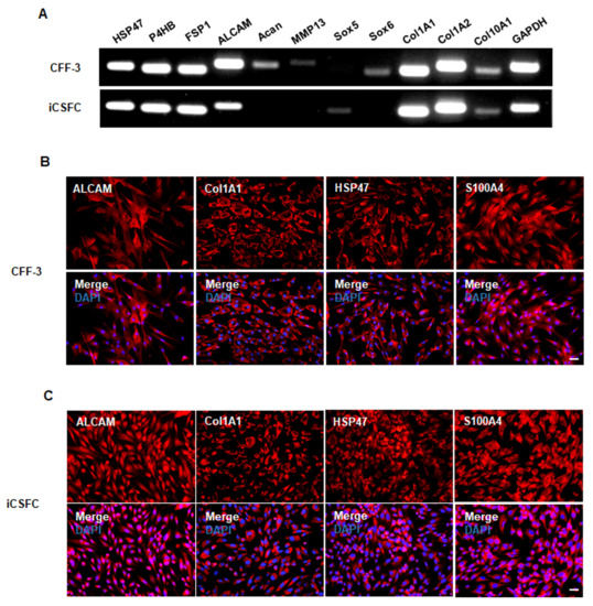To analyze the characteristics of the CFF-3 cells and iCSFCs at the genetic level, we performed RT-PCR on well-known fibroblast-specific genes (Supplementary Table S1), including HSP47, P4HB, FSP1, ALCAM, Acan, MMP13, Sox5, Sox6, COl1A1, COl1A2, and COl10A1. The fibroblast-derived CFF-3 cells expressed the fibroblast markers HSP47, P4HB, FSP1, ALCAM, Acan, MMP13, Sox6, COl1A1, COl1A2, and COl10A1 but did not express Sox5 (Figure 4A). The iCSFCs expressed several fibroblast markers, including HSP47, P4HB, FSP1, ALCAM, Sox5, COl1A1, COl1A2, and COl10A1 but lacked detectable levels of Acan, MMP13, and Sox6 (Figure 4A). Immunocytochemical staining confirmed the expression of fibroblast marker proteins such as ALCAM, COl1A1, HSP47, and S100A4 by iCSFCs and CFF-3 cells (Figure 4B,C). These results indicated that iCSFCs maintain fibroblast properties in vitro.