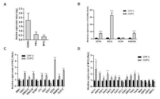 Comparison of the expression of CORE, PRC and MYC module genes in iCSFCs. (A) Average gene expression values (log2) of CORE, PRC, and MYC module genes in iCSFCs using values from CFF-3 cells as references; 4 CORE, 11 PRC and 16 MYC module genes were included in the qPCR analysis. (B) Expression levels of OCT4, SOX2, NANOG and KLF4 were compared by qPCR in CFF-3 cells and iCSFCs. In iCSFCs, we observed that 3 CORE module genes (OCT4, SOX2, NANOG) were increased and 1 gene (KLF4) was decreased compared to CFF-3 cells. (C) Expression comparison of the PRC module genes in iCSFCs and CFF-3 cells. Eight genes showed elevated expression levels in iCSFCs compared with CFF-3 cells. (D) Comparison of MYC module gene expression in iCSFCs and CFF-3 cells. Eleven genes showed increased expression levels in iCSFCs compared with CFF-3 cells. Data shown in graphs are the means ±SEM of four independent experiments. *, p < 0.05; **, p < 0.01; ***, p < 0.001.