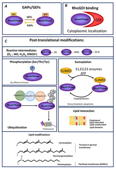 With the exception of RhoBTB1 and RhoBTB2, post-translational modification by lipids was described for all Rho GTPases [], modulating their location and interaction with specific GEFs, and consequently their feeding into downstream signaling pathways. Among them, prenylation and palmitoylation are particularly relevant.